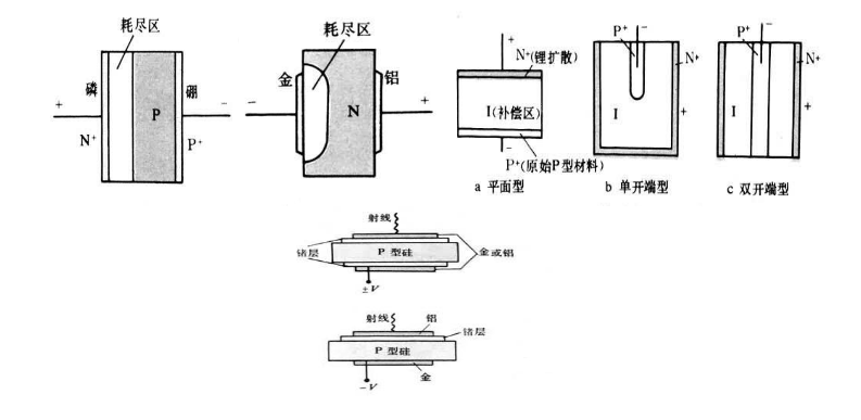 通常使用的半导体探测器主要有结型、面垒型、锂漂移型和高纯锗等几种类型(下图由左至右)。金硅面垒型探测器1958年首次出现,锂漂移型探测器60年代初研制成功,同轴型高纯锗(HPGe)探测器和高阻硅探测器等主要用于能量测量和时间的探测器陆续投入使用,半导体探测器得到迅速的发展和广泛应用。